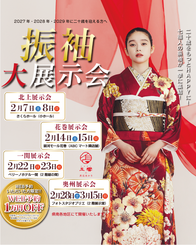 岩手県南各地で「振袖大展示会」を開催いたします!🎉 一生に一度の成人式。自分にぴったりの一着を、県内最大級の品揃えの中から見つけませんか?