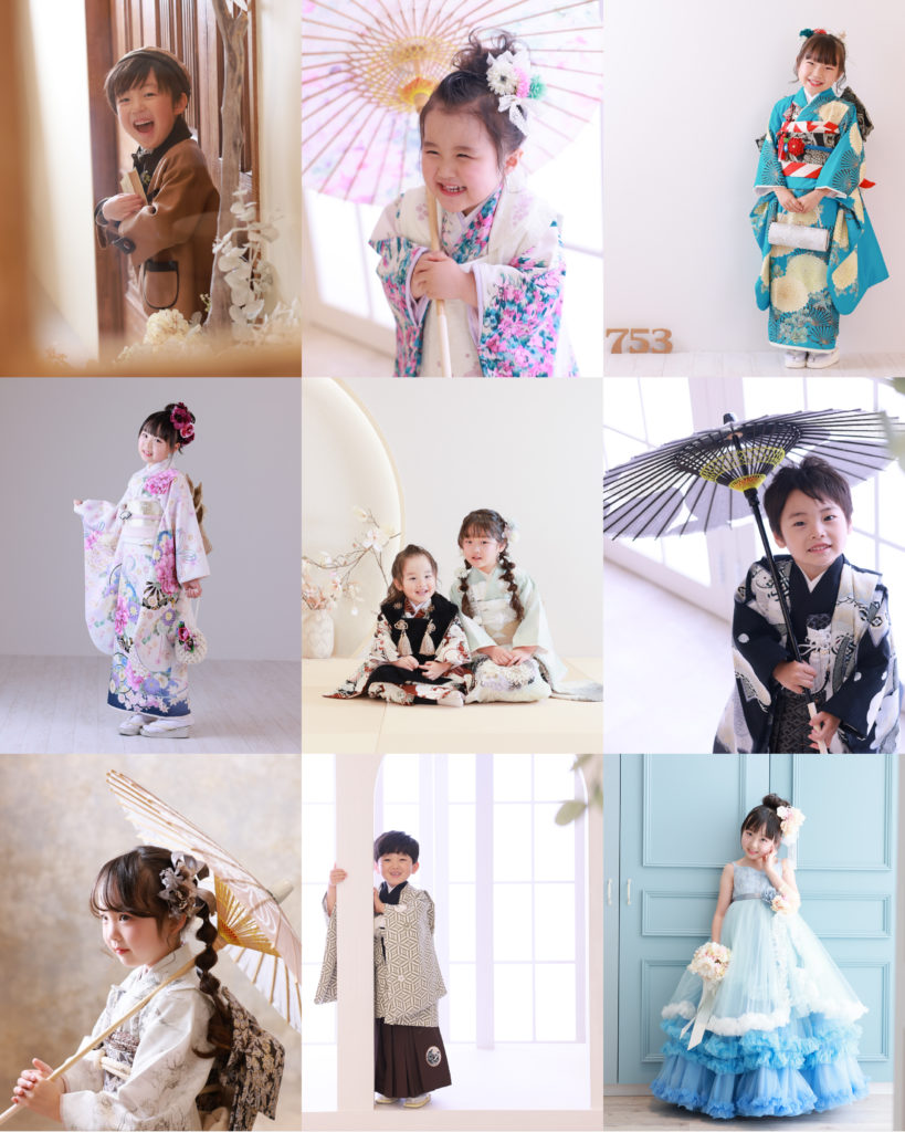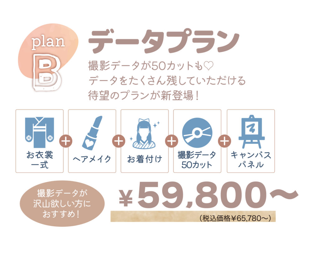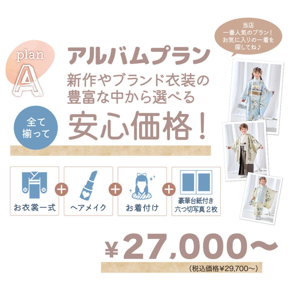 【七五三フルセットプラン】 Aプラン/ アルバムプラン 3歳・5歳・7歳 ¥27,000より(税込価格29,700円) プラン内容:お衣裳+ヘアメイク+お写真六つ切2ポーズBプラン/データプラン データがたくさんほしい人におすすめのプランができました!